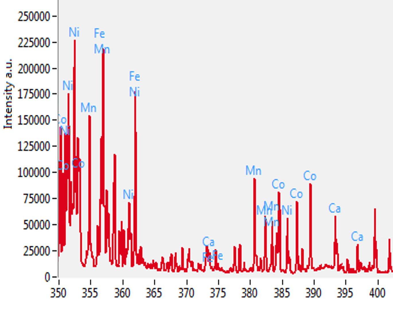 The figure below shows the typical LIBS spectra from LiNiMnCoO2 cathode materials with all elemental lines identified by TruLIBS. The analysis also showed contaminants in the samples, such as Fe (iron), Ca (calcium), and Na (sodium) that can be quickly screened.